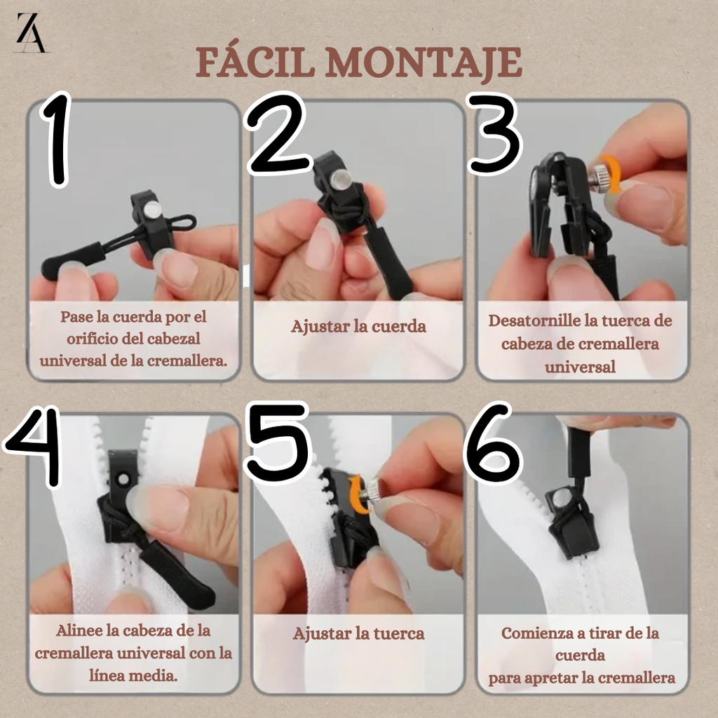 Olvídate de complicados kits de reparación o costosos reemplazos. ZipFix™ no requiere herramientas, y suinstalación es rápida y sencilla. Solo colócalo y fíjalo adaptando la tuerca, ¡y tu cremallera estará como nueva! Ideal para cualquier tipo de accesorio o ropa, desde mochilas hasta chaquetas, la instalación se completa en segundos.