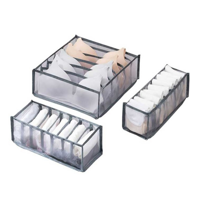 Con este set de organizadores de ropa interior y medias puedes mantener todo en su sitio, son de diferentes tamaños, la más ancha sirve para guardar los brasieres, y hay otras dos con el mismo tamaño, solo los diferencia los espacios; uno es de 6 espacios y sirve para los sujetadores y el otro de 10 espacios para la ropa interior, con el último de 7 espacios puedes ubicar cómodamente las medias, si haces suficiente espacio puedes ingresar más medias y más ropa interior.